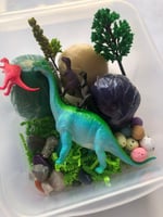 The Dinosaurs Busy Box contains several trinkets and play dough that will allow your child to use their imagination to create scenes, build and construct, develop fine motor skills and use their creativity. All items can be used and loved time and time again, creating zero waste and hours of fun. Children are able to sort the items and place them back in their spots to build a sense of responsibility for their own things. I personally use my Busy Boxes as a reward for my children and they feel that it is something special and take pride in looking after their items. I love to see their imagination at work and they are always proud to show me what they have come up with!